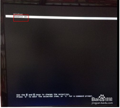 6、重啟電腦。啟動(dòng)后我們就可以看到原來的系統(tǒng)和Phoenix OS。在鍵盤上按方向下鍵選擇PHOENIX系統(tǒng)。選中后按回車鍵進(jìn)入。