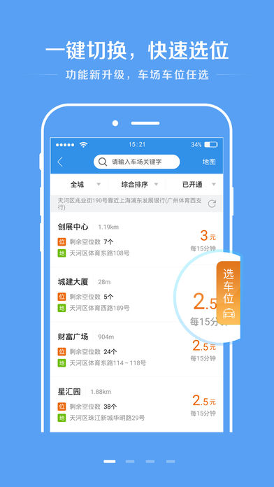 2、打開應用自動推薦附近車場及車位,3秒內(nèi)完成訂位;