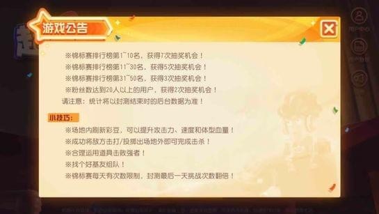 1、場地內(nèi)測刷新彩豆,可以提升攻擊力、速度和體型血量!2、成功將地方擊打、投擲出場外即可完成擊殺!
