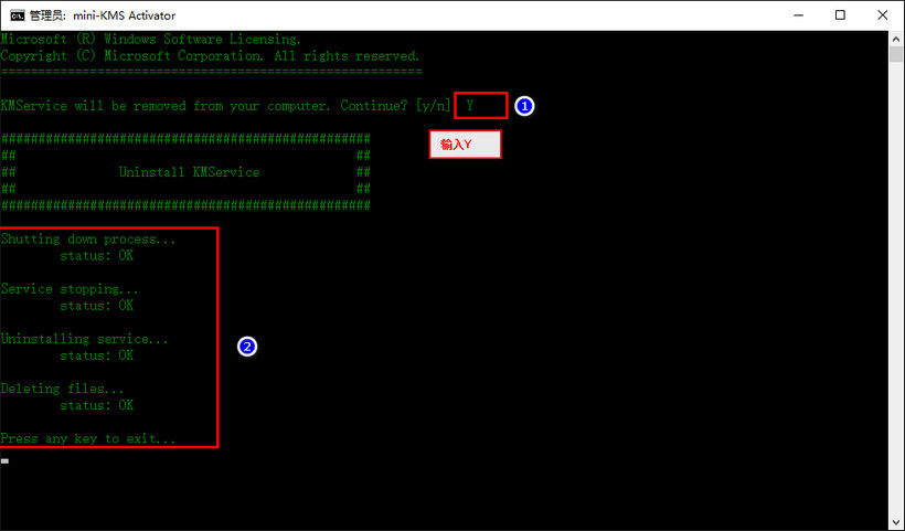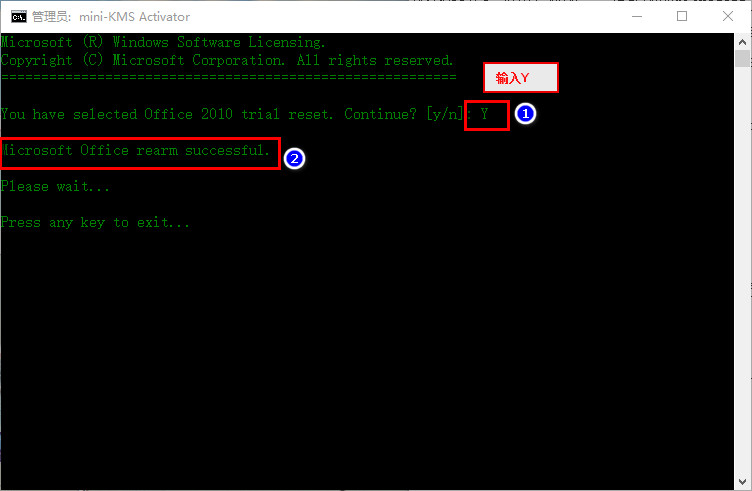 11.繼續(xù)輸入“Y”.然后會(huì)提示“Microsoft Office rearm successful”.按任意鍵退出。如下圖