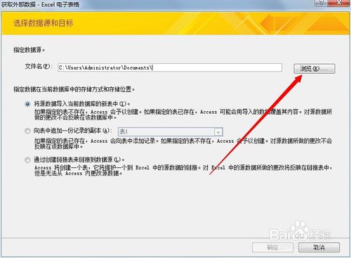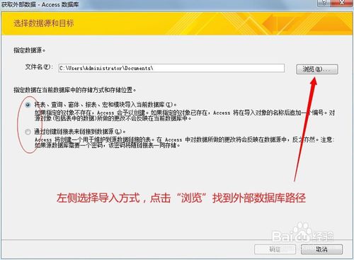 左側(cè)選擇你要導(dǎo)入外部數(shù)據(jù)庫(kù)的方式,點(diǎn)擊瀏覽,找到外部數(shù)據(jù)庫(kù)存放的路徑