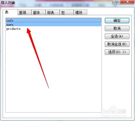 選擇外部數(shù)據(jù)庫(kù)你要添加的表,我們?cè)谶@選擇“info”和“news”2張表做演示。