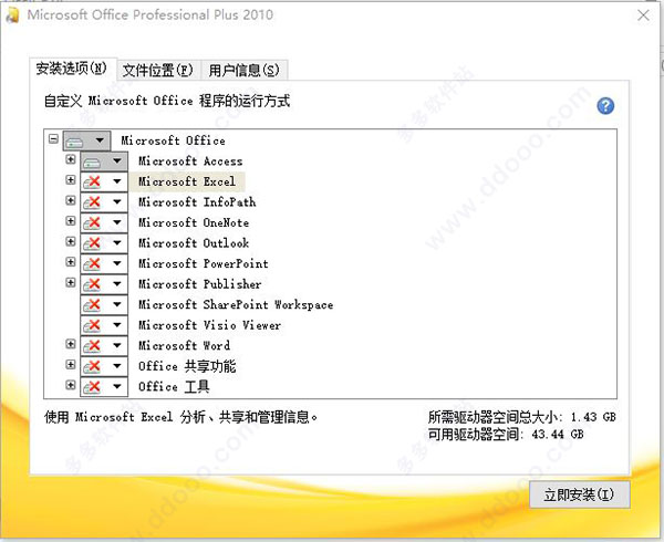 4、將其他軟件全部選擇為不可以,留下access2010即可,點(diǎn)擊立即安裝。