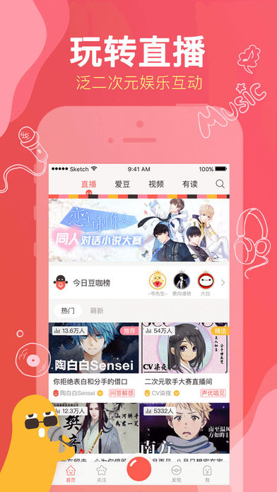 【直播】紅豆Live首創(chuàng)聲圖共享的直播模式,主打二次元、星座、情感等娛樂(lè)互動(dòng)直播,這里有國(guó)內(nèi)的人氣CV、唱見(jiàn)、coser、畫(huà)手、星座、情感主播為你帶來(lái)精彩的直播內(nèi)容,二次元的年輕小伙伴都在玩,你也快來(lái)吧!