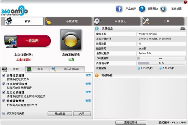 360Amigo System Speedup V1.2.1.8200 多國語言官方安裝版 360Amigo 一款國外著名的系統(tǒng)清理優(yōu)化工具,如果你認(rèn)為你的電腦很慢,用360Amigo System Speedup幫您的系統(tǒng)優(yōu)化清理垃圾,360Amigo主要有注冊表清理,隱私清理,PC優(yōu)化,錯(cuò)誤修復(fù)工具,檢測和刪除計(jì)算機(jī)上的所有垃圾。根據(jù)網(wǎng)友的測試清理垃圾比CCleaner還要更佳。