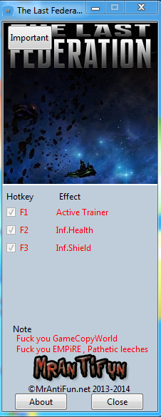最后的聯(lián)盟修改器是論壇大神“MrAntiFun”為最后的聯(lián)盟游戲制作的多功能游戲輔助工具。具有無限生命、無限護(hù)盾等兩項(xiàng)修改功能,能夠讓玩家的飛船永遠(yuǎn)不會墜毀,勇往直前,無所畏懼。【軟件功能】