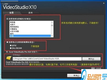 步驟4、在城市/區(qū)域中選擇“中國(guó)”,視頻標(biāo)準(zhǔn)不用管。選擇保存路徑,默認(rèn)C:\Program Files\Corel\Corel Video Studio Pro X10\,也可以根據(jù)自己的需要更改保存路徑。之后點(diǎn)擊立刻安裝。
