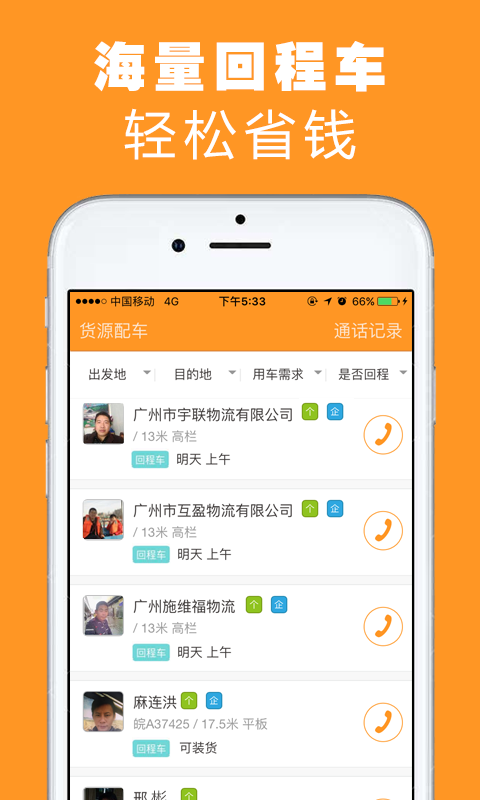 根據(jù)運(yùn)輸路線和車型要求,自動(dòng)匹配車源!輕松操作,足不出戶找回程車。
