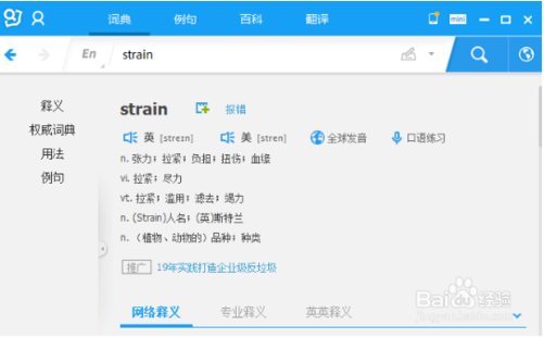 點擊翻譯助手,我們以單詞“strain”為例,如果考過四六級的學(xué)生不用查字典也應(yīng)該知道它的意思。