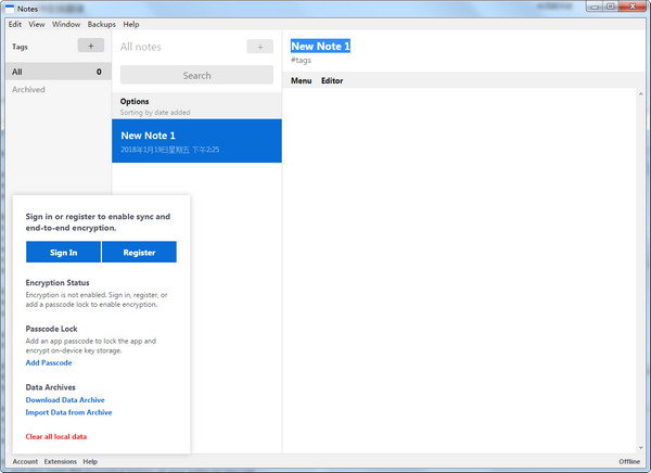 你的同步帳戶允許你訪問你的筆記,不管你在哪個設(shè)備上。創(chuàng)建同步帳戶也會創(chuàng)建一個強大的加密密鑰,從您的密碼。在app的左下方的菜單中點擊“account”設(shè)置一個賬戶。