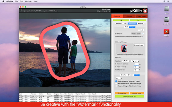 piQtility Mac版是一個Mac平臺上功能全面的圖片編輯軟件,piQtility Mac版使您很容易地對圖片進行水印添加,預(yù)覽,調(diào)整大小,排序,應(yīng)用照片過濾器,應(yīng)用圓角,框架,轉(zhuǎn)換或重命名您的圖片從用戶導(dǎo)向的界面。【軟件特點】