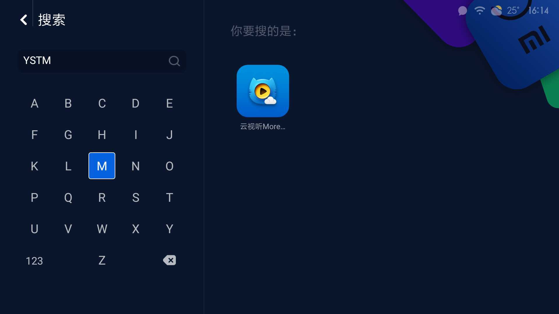 3.在搜索頁(yè)面,輸入“YSTM”,即云視聽(tīng)MoreTV首字母,即可搜索到電視貓視頻(云視聽(tīng)MoreTV);
