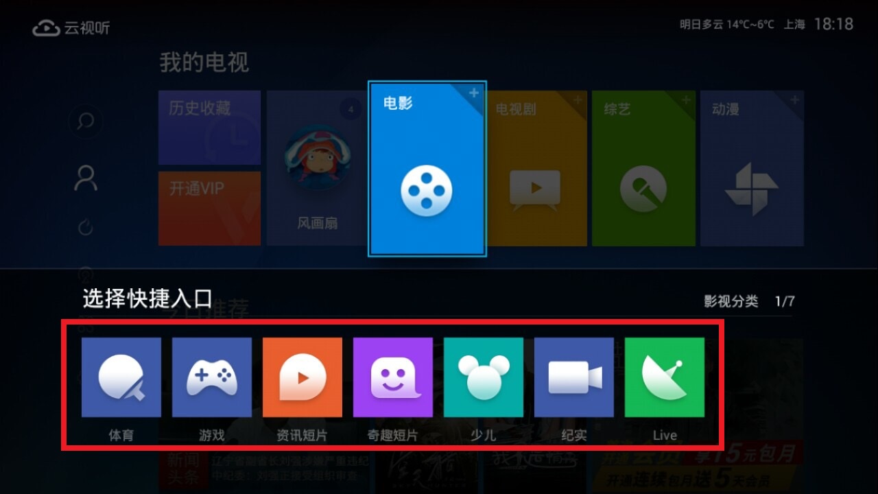 2.長(zhǎng)按OK鍵,出現(xiàn)替換模塊,共有9個(gè)內(nèi)容板塊隨心切換(電視劇、電影、體育、Live、綜藝、資訊短片、紀(jì)實(shí)、動(dòng)漫、少兒);