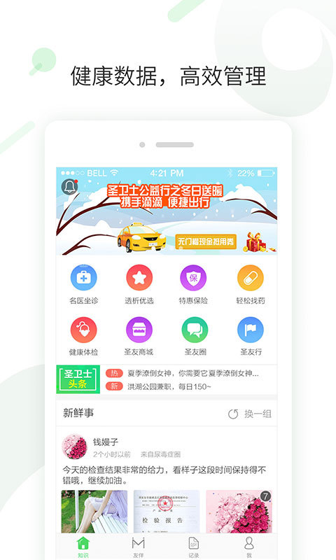 【友伴】通過(guò)短視頻的形式,用于用戶記錄與分享生活,通過(guò)友伴找到自己喜歡的內(nèi)容和感興趣的人,打造行業(yè)新星。【科普知識(shí)】對(duì)腎病細(xì)分為9類,每類病種都可搜索查閱認(rèn)識(shí)疾病、預(yù)防措施、治療方法、常用藥品、菜譜、運(yùn)動(dòng)等專業(yè)知識(shí)。