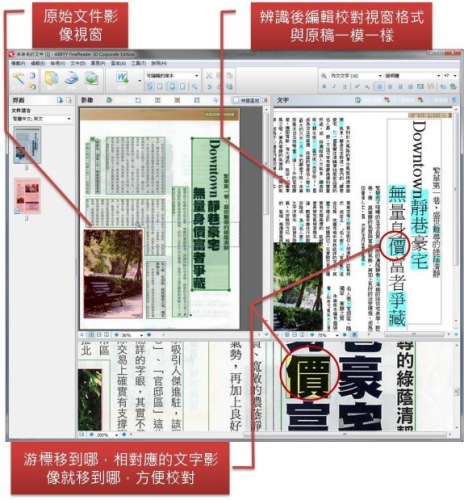 1.支持彩色文件識別.自動保留原稿插圖和排版格式以及后臺批處理識別功能,能夠直接在 MS Word.MS Excel.WordPerfect 及 Word Pro 中掃描和讀取文件.信件或各類表格,并且能存成 RTF.TXT.DOC.CSV.XLS 或 HTML 等格式。它能保持表格與圖片中原始的多欄頁面設計2.FineReader Professional 在識別方面支持 ADF (自動進紙)掃描儀,批處理,拼音檢查,強大的表格工具,多語言文件,背景運算和學習新的字體。