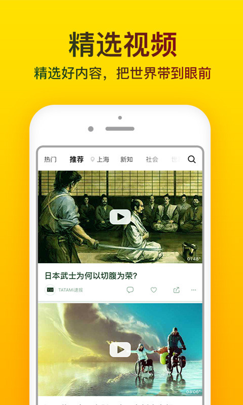 SNH48、一條、二更、暴走大事件、蘑菇街、動感101、彩虹室內(nèi)合唱團、拜托啦學(xué)妹、芒果TV、發(fā)條視頻、罐頭視頻、百度胥渡吧、校園老司機、一席、日食記、更上海、聯(lián)合國、一介視頻、谷阿莫、奇妙實驗室、飛碟說、NowThis、聯(lián)合國、僵小魚、凹凸視頻……總有一款適合你!首頁就是你的興趣,推薦更精準(zhǔn)!