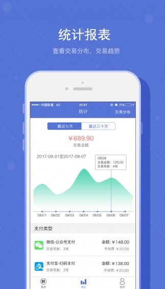 【收款】商戶可快速開通微信支付、支付寶、農(nóng)信快捷支付方式,支持消費(fèi)者掃碼支付、移動(dòng)支付、收款更便捷;【賬單】查詢每筆交易訂單狀態(tài),多維度查看交易情況;