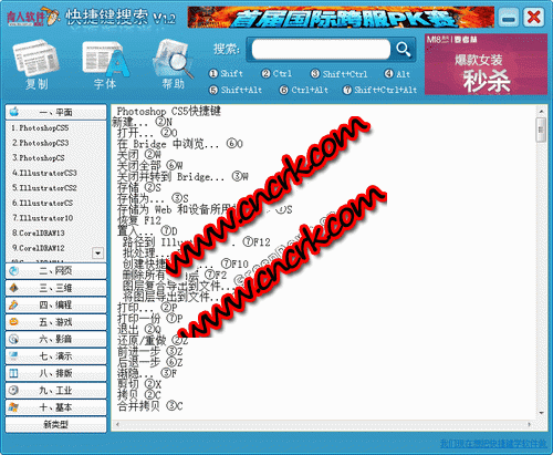 快捷鍵搜索是一款快捷鍵快捷鍵搜索的軟件,軟件里有平面、網(wǎng)頁(yè)、三維、編程、游戲、影音、演示、排版、工業(yè)、基本、新類型類型軟件的快捷鍵。