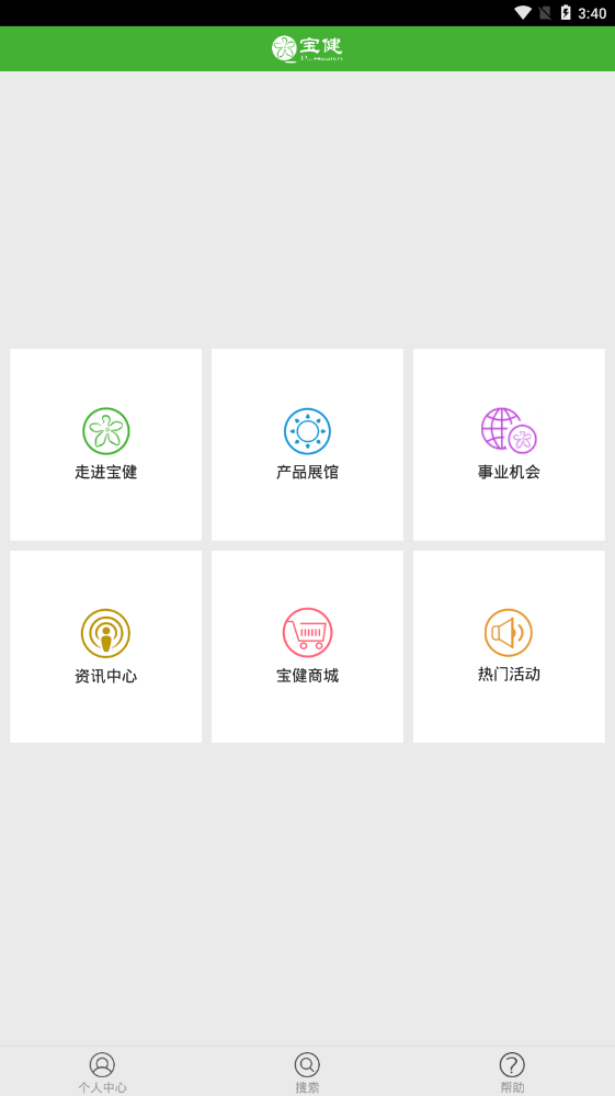 1.界面包括走進(jìn)寶健、產(chǎn)品展館、事業(yè)機(jī)會(huì)、資訊中心、寶健商城、熱門活動(dòng)等選項(xiàng),如圖: