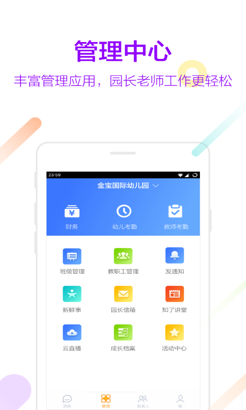 一個(gè)知了APP,可實(shí)現(xiàn)三種專(zhuān)業(yè)服務(wù)場(chǎng)景:【園長(zhǎng)】知了,不僅是家園溝通APP平臺(tái),更是園長(zhǎng)的移動(dòng)智慧顧問(wèn),輕松完成全員師生信息及考勤管理,園所通知發(fā)布,全員新鮮事查看管理等,便捷實(shí)現(xiàn)園務(wù)溝通。