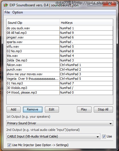 1、點擊Add來添加音頻2、然后上邊的邊框中左邊是你的音頻文件名,右邊可以設(shè)置播放音頻的快捷鍵,點擊edit是編輯快捷鍵