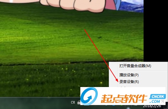 首先右鍵桌面右下角的喇叭,也就是音量控制,選擇菜單中的【錄音設(shè)備】