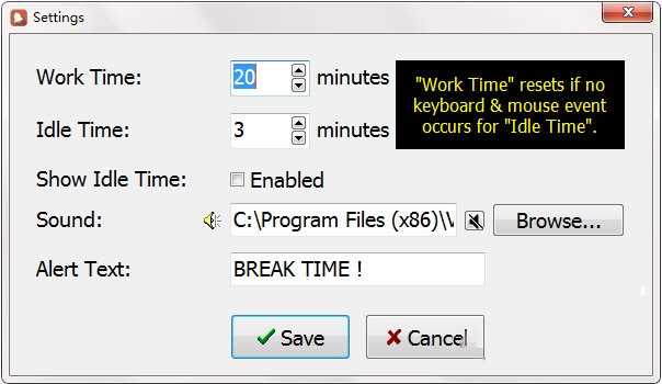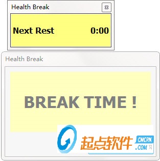 健康打破被發(fā)送到你的電腦的系統(tǒng)托盤在發(fā)射和只會增加一個小窗口在桌面上顯示計時器的工作。然而,盡管窗口可以調(diào)整大小,標(biāo)題欄不能刪除,字體大小不能增加,沒有額外可用的樣式。