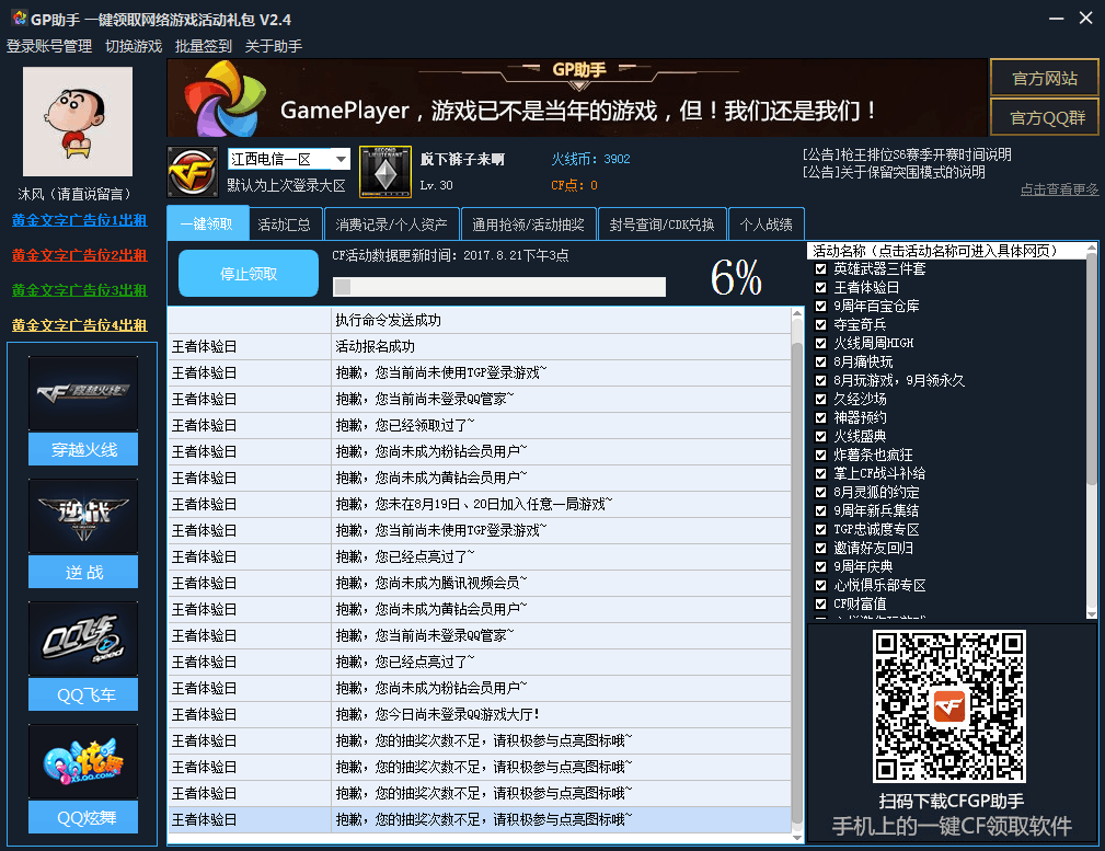 起點提供GP助手官方下載,GP助手是一款功能強大的熱門游戲活動一鍵領(lǐng)取助手,GP助手支持穿越火線、逆戰(zhàn)、QQ飛車、QQ炫舞等多款網(wǎng)絡(luò)游戲,通過它您就可以一鍵領(lǐng)取所有的活動獎勵,還可以一鍵簽到、查詢活動和封號,再也不用頻繁的登陸和切換游戲了。