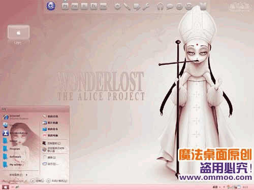 魔法桌面原創(chuàng)xp仿mac桌面主題——鬼娃娃仿蘋果。選用另類的《魔境愛麗絲》做壁紙,制作成粉色系的仿mac系列主題,讓你體會(huì)不一樣的陰森恐怖。主題包含三種字體版本,默認(rèn)是宋體版,您可以在“外觀”-“字體大小”處切換至微軟雅黑版或是arial字體版。此主題還附帶精美的仿mac登陸界面哦