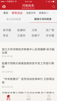 河南政務(wù)客戶端現(xiàn)開(kāi)通要聞、河南、領(lǐng)導(dǎo)活動(dòng)、部門、地方、民生保障、法規(guī)文件、政策解讀、公告公示、圖片新聞等欄目,第一時(shí)間權(quán)威發(fā)布河南省政府重大決策部署和重要政策文件、河南省政府領(lǐng)導(dǎo)同志重要會(huì)議、考察、出訪活動(dòng)等政務(wù)信息,同時(shí)面向社會(huì)提供與政府業(yè)務(wù)相關(guān)的服務(wù),建設(shè)基于新媒體的政府與公眾互動(dòng)交流新渠道。