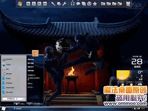 魔法桌面原創(chuàng)xp仿windows7桌面主題——浪漫刺客,主題的開始菜單和窗口都使用了直角模式,并且采用仿windows7的寬任務(wù)欄以及底邊欄樣式,美觀、新穎。為了獲得最佳顯示效果,請將桌面圖標(biāo)大小調(diào)整為32×32。本主題包含兩種字體版本,默認(rèn)是宋體版,您可以在“外觀”-“字體大小”處切換至微軟雅黑版。此主題還附帶精美的仿windows7登陸界面哦