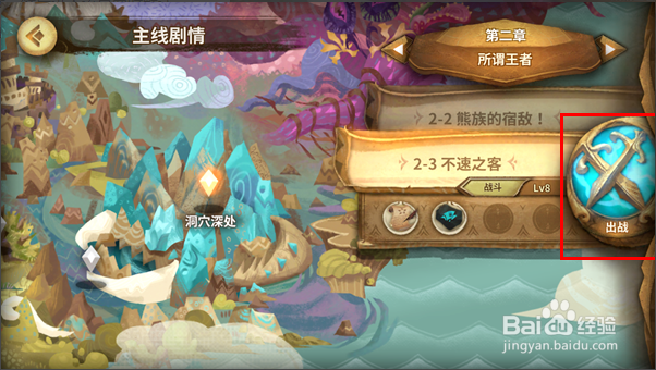 第二步,通過(guò)滑動(dòng)出戰(zhàn)旁的標(biāo)簽選擇劇情(一般按順序挑戰(zhàn),然后進(jìn)入該頁(yè)面時(shí)默認(rèn)為繼續(xù)上次的挑戰(zhàn)),接著點(diǎn)擊右側(cè)最大的按鈕(出戰(zhàn)),如下圖所示: