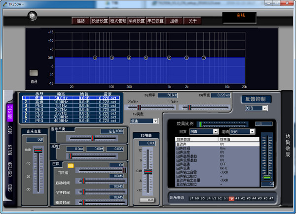 頂力TK250ADSP卡拉OK軟件是一款超級(jí)好用的電腦卡拉OK軟件。它的主要功能就是可以對(duì)卡拉OK設(shè)備進(jìn)行連接設(shè)置,能設(shè)置音樂音量、音樂平衡、效果比例、音樂變調(diào)等,而且還可以成設(shè)備、窗口、程式、系統(tǒng)等及新興設(shè)置。【軟件特點(diǎn)】
