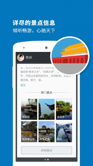 蘇州導(dǎo)游app:專業(yè)的智能語音導(dǎo)游系統(tǒng),專門為喜歡自由行的旅行愛好者而設(shè)計。雨花臺導(dǎo)游是將語音導(dǎo)游、門票信息、旅游攻略、景點美圖、旅游足跡等全面集中展現(xiàn)。 我們的智能軟件像一個經(jīng)驗豐富的導(dǎo)游,當(dāng)您進入景區(qū)時,及時地向您推薦您當(dāng)前的游覽線路及沿 途景點;當(dāng)您漫步在景區(qū)時,蘇州導(dǎo)游能根據(jù)當(dāng)前您所處的景點位置,為您提供生動的語音解說及詳盡的圖文介紹;當(dāng)您處在景區(qū)外時,蘇州導(dǎo)游是一本妙趣橫生的百科全書,圖文 并茂地向您展示著景區(qū)深邃的文化內(nèi)涵和豐富的歷史積淀,讓您體驗到景區(qū)身臨其境的愉悅感。