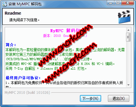 MyMPC增強包2010(增強包)為 mympc 解碼包的補充增強包,不建議單獨使用。本安裝包集成 potplayermini 播放器精簡版,及其它一些解碼器。采用 7-zip 自解壓 + silence 的 myinstall 打包。
