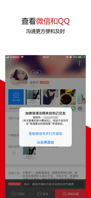 【微信溝通】高級(jí)會(huì)員可直接與真會(huì)員微信或QQ溝通,交友更方便快捷;