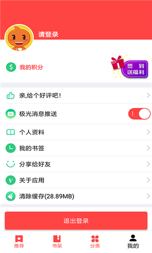 5、我的功能有:我的積分、親給個好評、極光消息推送開關(guān)、個人資料、我的書簽、分享給好友、關(guān)于應(yīng)用、清除緩存、、登錄、注冊、退出登錄