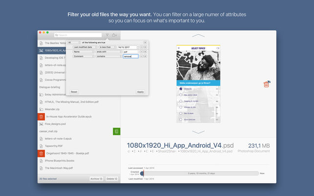 你的電腦的存儲已經(jīng)滿了,但你不知道該刪除什么?現(xiàn)在你可以使用Fossils Mac版來找到你不再需要的舊文件了。查找、刪除或歸檔舊文件。方便地瀏覽您的文檔,并決定是否要刪除或歸檔文檔。快速預(yù)覽你的文件,然后刪除或歸檔。