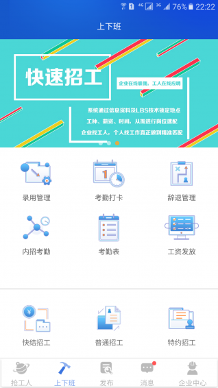 喂喂打工快結(jié)招工、特約內(nèi)招、特約外招的多入口招工方式,依托實名制監(jiān)管系統(tǒng)、反垃圾審核系統(tǒng)及人工審核系統(tǒng),實行先認(rèn)證方可發(fā)布。引入第三方支付機(jī)構(gòu)對用戶進(jìn)行實名考勤登記及監(jiān)管支付,真正做到招工找工信息真實可靠,工資完工即結(jié)算,解決勞務(wù)工資不可控的問題。【更新日志】