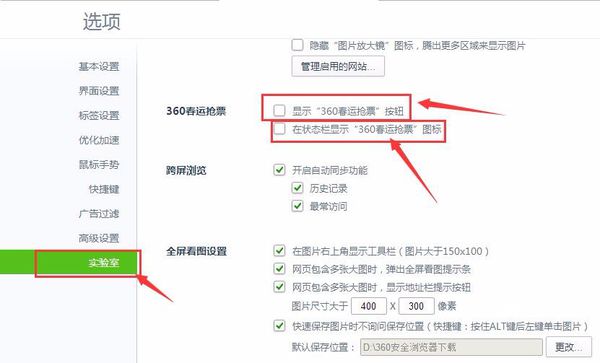 2、點擊選項設(shè)置頁面左側(cè)的“實驗室”,然后把“360春運搶票”后面的選項方框里的√去掉,關(guān)閉瀏覽器重新打開,看看是不是不見了???