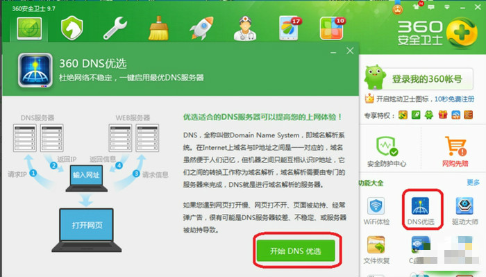 4、DNS優(yōu)選 如圖所示,打開殺毒軟件——點擊DNS優(yōu)選——點擊開始DNS優(yōu)選——立即啟用,效果如圖所示。