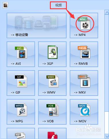 打開此軟件后,我們首先在左方選擇“視頻”,再選擇想要轉(zhuǎn)換的視頻格式(這里指的是轉(zhuǎn)換后的視頻格式),例如我們選擇轉(zhuǎn)換成MP4,就選擇-》MP4。