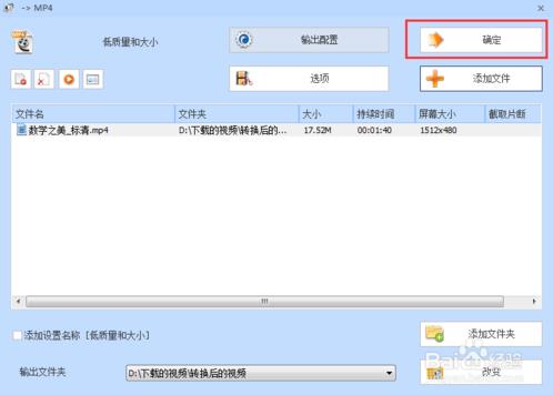 進入輸出配置后,我們點擊上方“預設(shè)配置”,在下拉選項中根據(jù)視頻的情況選擇合適的選項,我們要壓縮視頻,一般選擇比原視頻低級的視頻質(zhì)量,選擇完畢后點擊”確定“。
