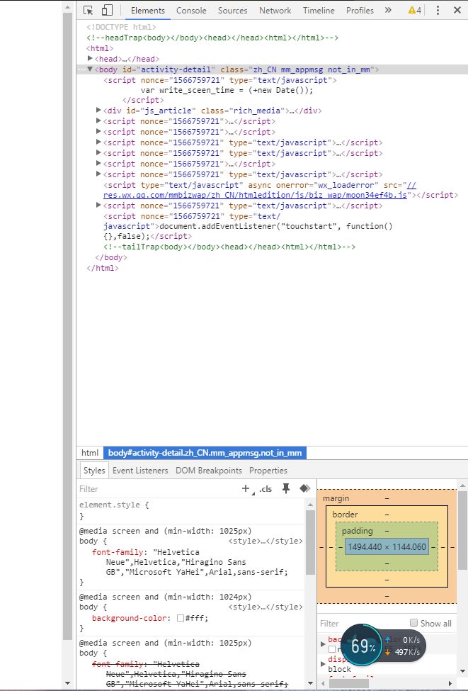 1、將微信公眾號文章在瀏覽器中打開,之后同時按Ctrl+Shift+I,在右側會彈出這樣的畫面