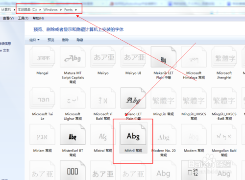第五步:在FONTS文件夾中粘貼完我們的字體之后,為了確保我們的字體是否已成功復(fù)制粘貼在FONTS文件夾里,我們可以在FONTS文件夾內(nèi)行我們的字體查找。