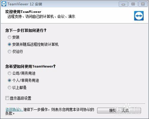 隨后我們會看見打開界面,并選擇:①安裝并隨后遠(yuǎn)程控制該計算機(jī) ②個人/非商務(wù)用途。然后點擊右下角“接受-完成”。