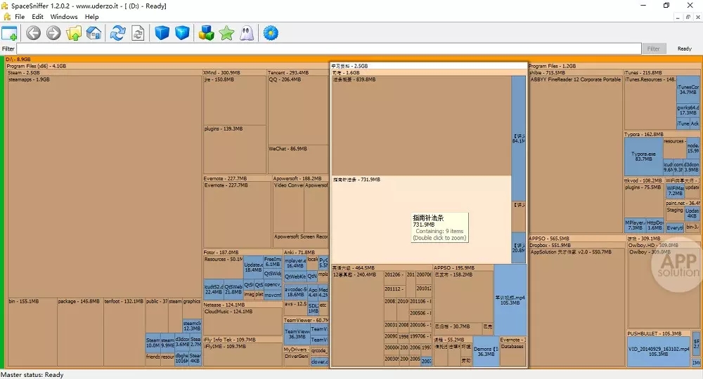 SpaceSniffer可以很直觀的以區(qū)塊,數(shù)字和顏色來(lái)顯示硬盤(pán)上文件夾,文件大小。還能用篩選器過(guò)濾出要找的文件。點(diǎn)擊每個(gè)區(qū)塊能進(jìn)入該文件夾得到更詳細(xì)的資料。只需要右鍵單擊盒子就能獲得基本屬性信息。雙擊文件夾框縮放顯示你嵌套文件夾內(nèi)的文件。
