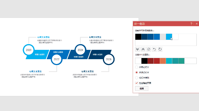 在「統(tǒng)一色彩」中,你可以看到當前PPT所使用的所有顏色,以及所使用的主題色