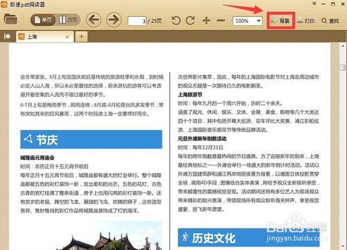 在極速PDF閱讀器的首頁(yè)右上方的位置,我們會(huì)看到有幾個(gè)應(yīng)用功能菜單,包括“背景”、“打印”、“查找”等,我們選擇“背景”,如圖所示。