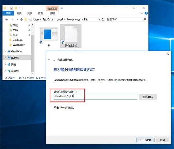 想要實(shí)現(xiàn)執(zhí)行命令,比如 F6 + R 重啟電腦,那么在 F6+回車 彈出的目錄下,右鍵點(diǎn)新建快捷方式,其對象位置填寫為關(guān)機(jī)命令:shutdown /r /t 0,然后再將這個快捷鍵改名為 R 即可。想執(zhí)行其他命令也都是一樣,你還可以執(zhí)行更加復(fù)雜的 .bat 批處理;或者,在“對象位置里填寫網(wǎng)址”就能打開指定的網(wǎng)站。